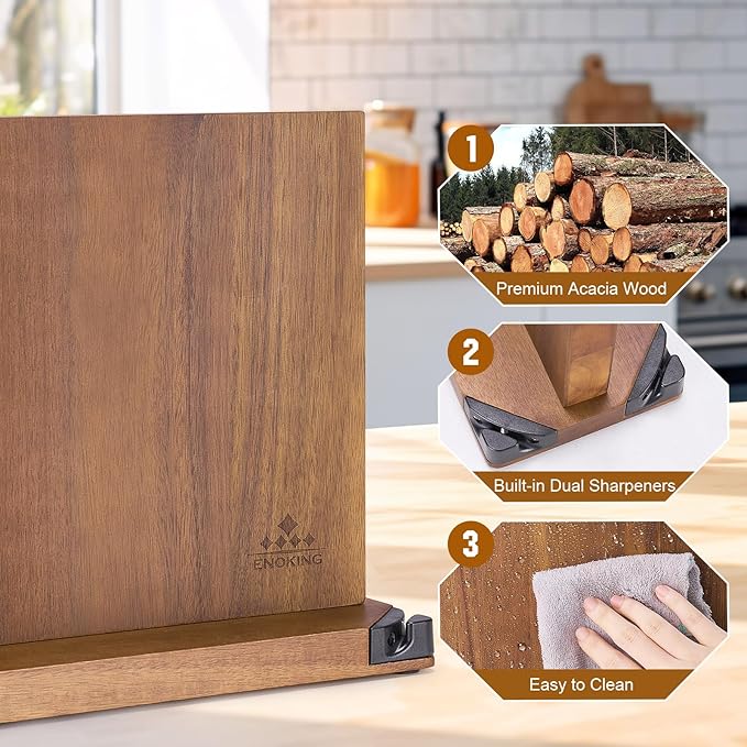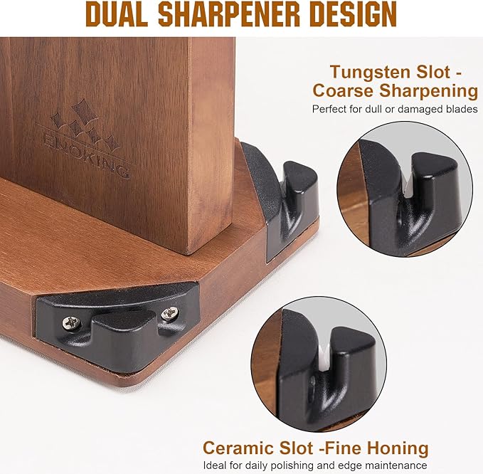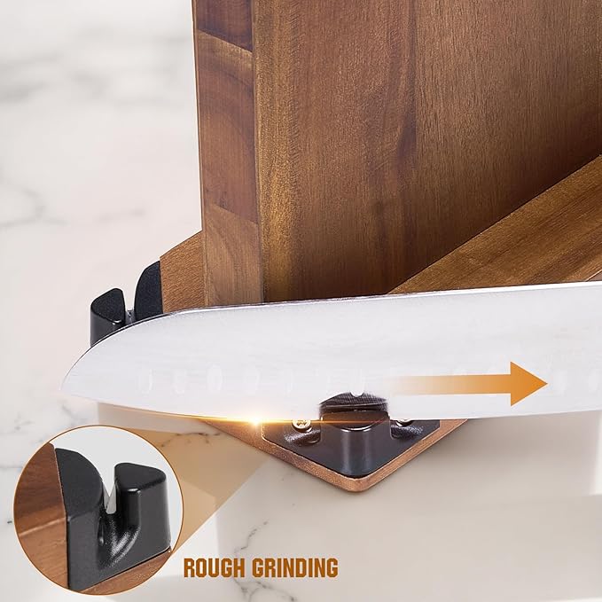 • Built-In Dual Sharpeners for Everyday Use-Features two built-in sharpeners for quick blade touch-ups. Keep your knives razor-sharp and ready—without leaving the stand. A truly multifunctional addition to any wooden kitchen.