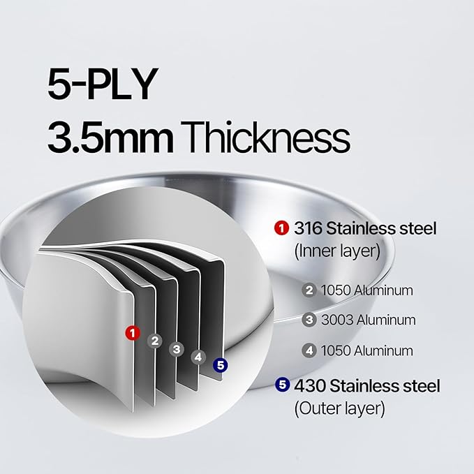 • 5 ply bonded stainless steel cookware construction with 3.5 mm thickness ensures durability stability and even heat distribution across multiple pans included in the set for professional level results