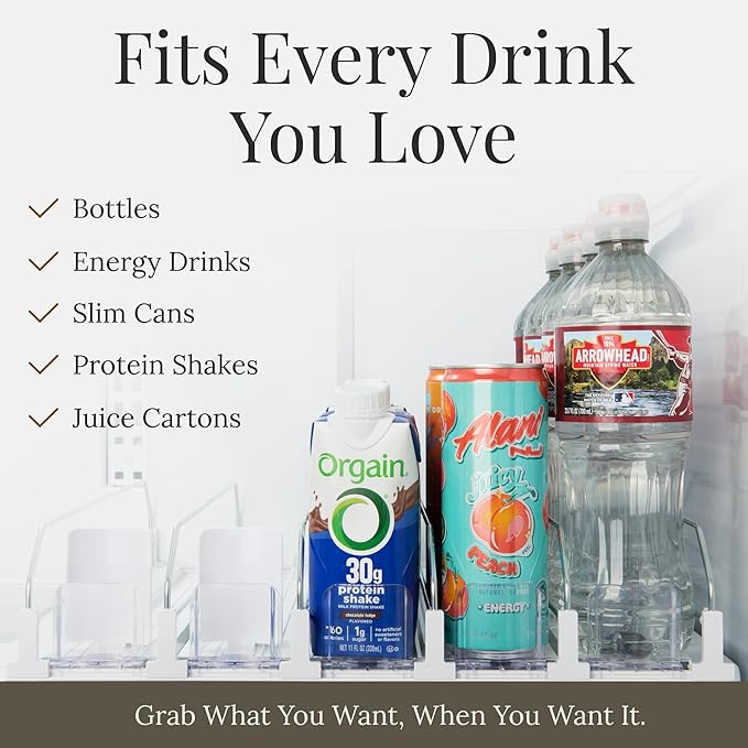 • 𝙃𝙤𝙡𝙙𝙨 𝘾𝙖𝙣𝙨, 𝘽𝙤𝙩𝙩𝙡𝙚𝙨, 𝙖𝙣𝙙 𝙈𝙤𝙧𝙚: Fits standard 12 oz soda cans, tall energy drinks, 16.9 oz water bottles, and more. The adjustable spacing keeps all beverages securely in place, whether you’re organizing a fridge, pantry, breakroom, or RV.
