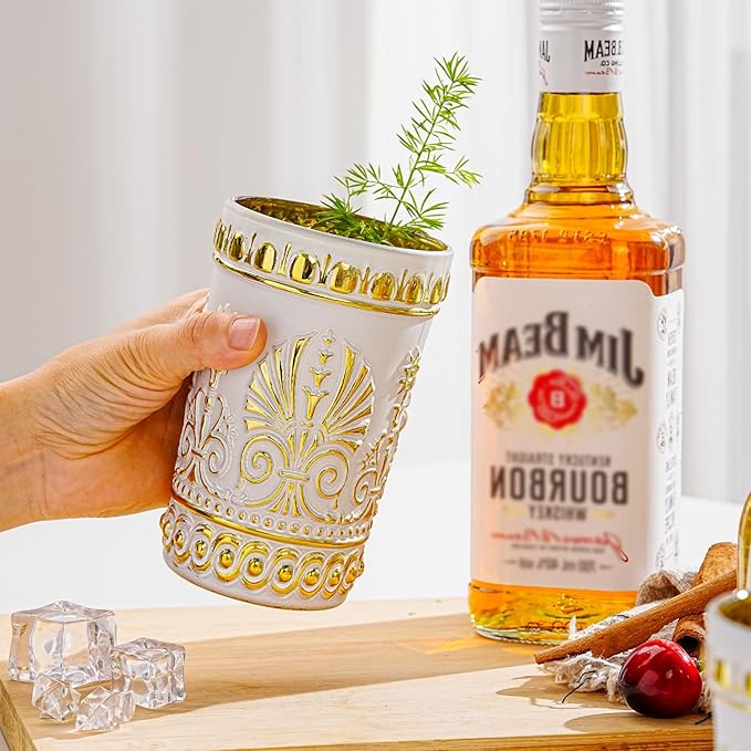 • Elegant Vintage Design: Each glass features intricate embossed scrollwork and a baroque-style motif, adding a timeless charm to your table or drinkware collection.