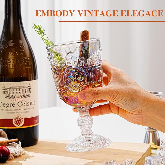 • Elegant Vintage Design: Each glass features intricate embossed scrollwork and a baroque-style motif, adding a timeless charm to your table or drinkware collection.