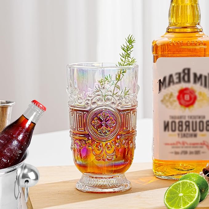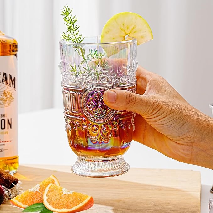 • Elegant Vintage Design: Each glass features intricate embossed scrollwork and a baroque-style motif, adding a timeless charm to your table or drinkware collection.