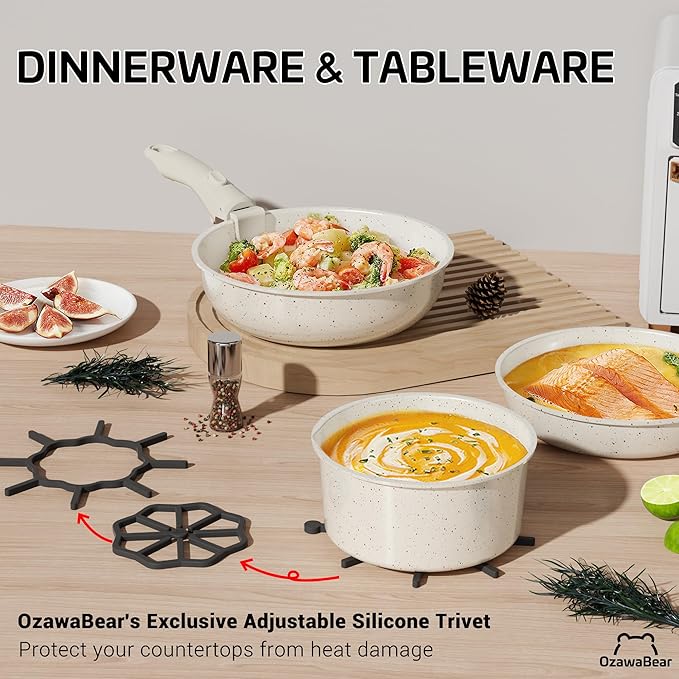 • Functional Cookware Set: Use as tableware, bakeware, dinnerware, grill pans, or fridge storage (with lid). Includes OzawaBear's exclusive adjustable silicone trivet to protect your countertops from heat damage.