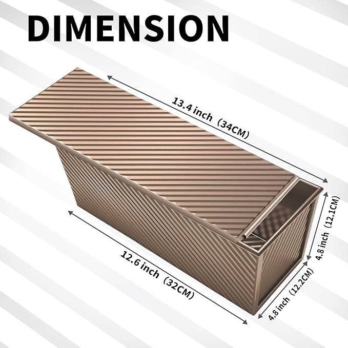 • LARGE SIZE PULLMAN LOAF PAN- The 13"x4" bread pan is made of thicken heavy duty carbon steel, thickened by 0.5 mm, with ventilation holes at the bottom to facilitate air circulation, so that the baking is even and crispy inside and outside, and the material enhances corrosion resistance, superior thermal conductivity, easy maintenance and durability.