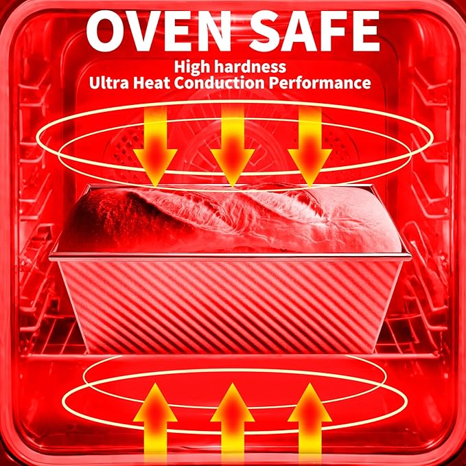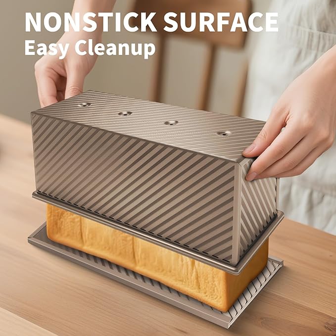 • NON-STICK & VENTILATED BASE DESIGN- The black-coated sandwich bread loaf pan‌ ensures effortless bread release without damaging its shape. Additionally, the ‌ventilated base design‌ promotes ‌even heat distribution‌ for richer flavor and texture. Note: When baking batter, brushing a small amount of cooking oil makes it simple to unmold the bread and easier to clean.