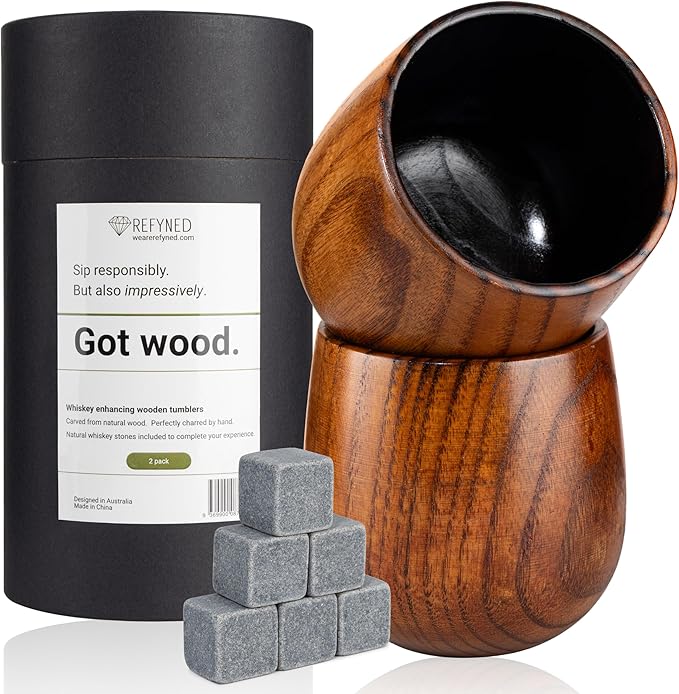 - Built to Last: Say goodbye to delicate glassware. Refyned's Got Wood. wooden whiskey glass is made from sturdy, premium-grade wood, offering exceptional resistance to cracks and damage. Crafted for longevity, our bourbon glass is a timeless addition to your drinkware that will accompany countless memorable moments. Our whiskey gift set is a great anniversary gifts for men, boubon gifts for men and groomsmen gifts.