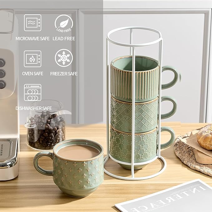 • Stackable,Large and Easy to Grip】Each mug measures at 3.9" in diameter and 3.5" in height. Capacity: 15 oz.These coffee mugs set were designed with stacking base that can stack up well within a wire frame to make efficient use of space and bring a note of style to your kitchen! These coffee mugs comfortable and ergonomic handle for a secure and comfortable grip.