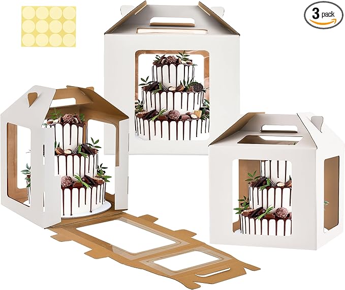 XININSUN 3 Pack Tall Cake Boxes for Tier Cake with 6 windows 14X14x14 Inch cake transport container,Bakery Take Out Transport Containers Tall Cake Carrier with Handle for Wedding, Birthday, Party