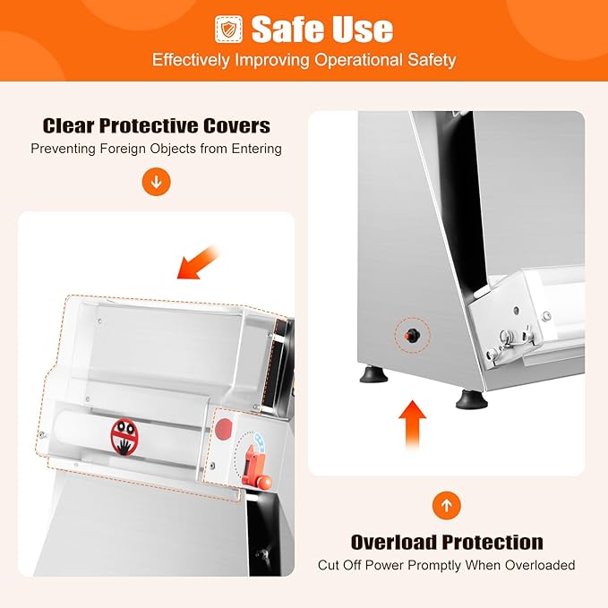 • Safe to Use: This commercial dough rolling machine is easy to operate. Just put the dough into the upper roller inlet, and the machine will process it automatically. The outside of the roller is equipped with a transparent protective cover, which effectively enhances operational safety and prevents foreign objects from entering the roller.