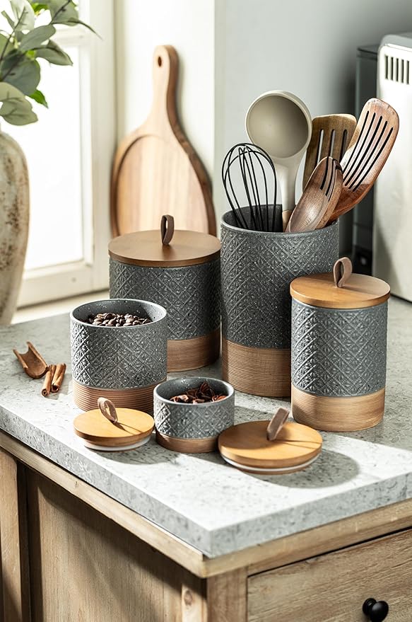 • Charming Embossed Design: Its farmhouse embossed patterns make this ceramic jar with lid a delightful kitchen accent, blending utility with visual appeal