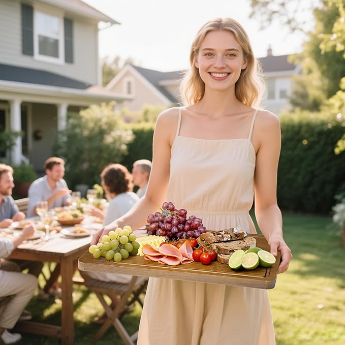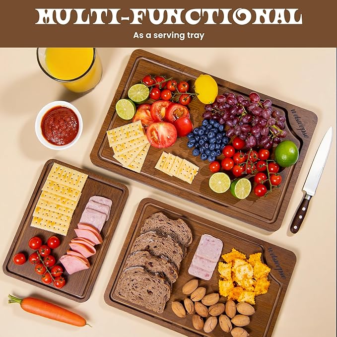 - Thoughtful Design with Handles and Juice Grooves - For effortless transportation and added convenience, our bamboo cutting board feature built-in handles on the sides, allowing you to move your cutting station with ease. The deep juice grooves around the edges catch excess liquids from meats and fruits, keeping your countertop clean and tidy. These thoughtful design elements make our wood board not only functional but also a breeze to clean up, ensuring a neat and tidy kitchen space.