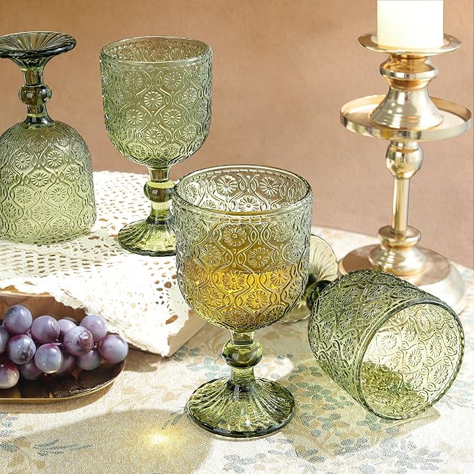 Joeyan Vintage Glass Wine Goblet,Green Embossed Floral Stemmed Wine Glasses,Colored Drinking Cups,Heavy-Duty Glassware for Wedding Party Bar,12 oz,Set of 4,Dishwasher Safe