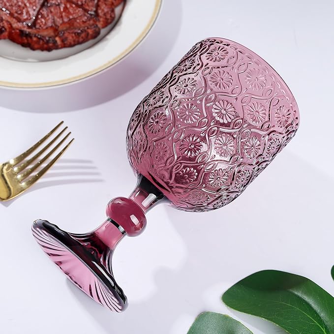 Joeyan Vintage Glass Wine Goblet,Embossed Floral Stemmed Wine Glasses,Colored Drinking Cups,Heavy-Duty Glassware for Wedding Party Bar,Multicolor,12 oz,Set of 4,Dishwasher Safe