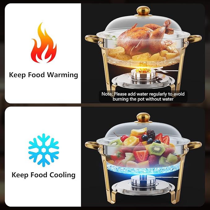 - Keep Food Warm & Cool: Our chafing dish buffet set utilize the power of the water vapor cycle to allow for even heating during the warming process, adding hot water to the water basin keeps hot foods such as entrees, side dishes, soups, stews, and stir-fries warm; In addition, the Meal Pots can be used to add ice cubes to keep salads, desserts, ice cream, fruits, etc. to keep the food fresh and cool