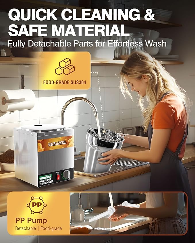 - QUICK & EVEN HEATING: WantJoin hot fudge warmer with pump uses water bath to heat evenly without burning your sauce; the sauce bucket is made of stainless steel with fast heat conduction, so it can be quickly preheated to the temperature you want in just 8-10 minutes, and it can maintain that temperature continuously, providing you with smooth and warm sauce all day long.