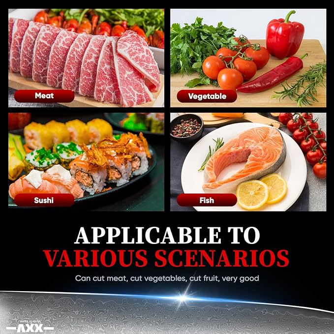 • MULTI-PURPOSE SASHIMI KNIFE-Mainly used for filleting, slicing and cutting delicate foods such as raw fish or sashimi, sushi rolls, but also for other soft ingredients such as tofu and soft cheeses