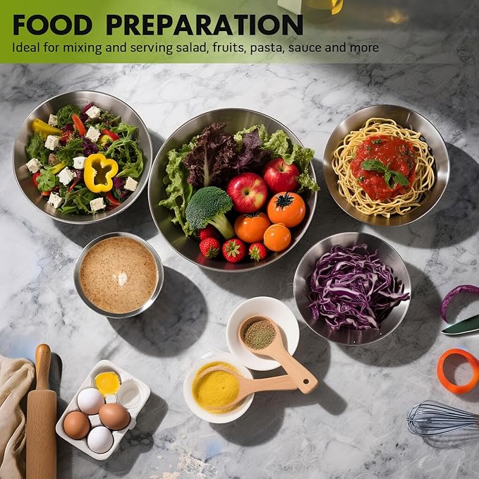 • 【Maximize Your Space】The perfect nested design allows all 5 stainless steel bowls nest nicely together, organize your kitchen efficiently without cluttering your shelves. Perfect for small apartments and kitchens without sacrificing utility