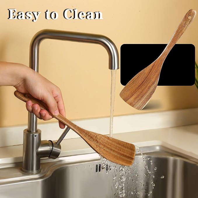 - 【Quick-Clean & Low Maintenance】Busy home chefs, rejoice! Our kitchen utensils set wipe clean in seconds: just rinse with warm water (no dishwashers – preserves the wood’s integrity!). The non-porous teak won’t trap grease or odors like silicone tools. Air-dry vertically using built-in hanging holes to save drawer space. Plus, monthly rub with food-safe oil keeps your wooden spoons set looking brand-new – zero fuss for maximum hygiene!