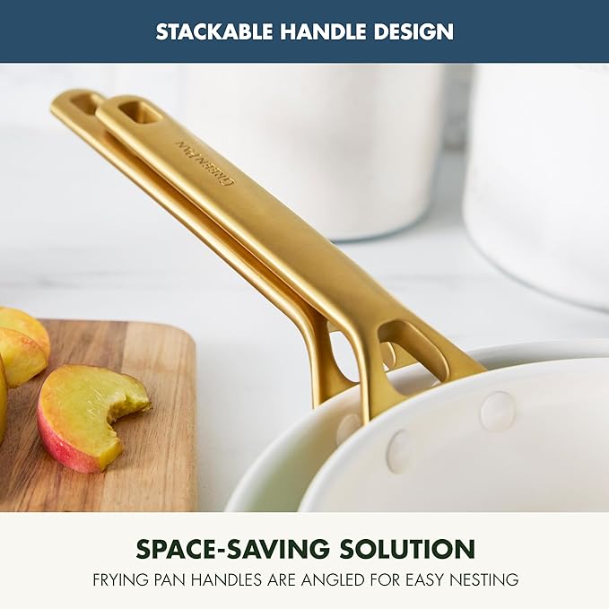• STAINLESS STEEL GOLD-TONE HANDLES: Riveted matte-finished handles offer a safe and secure grip while adding a pop of design to any kitchen.