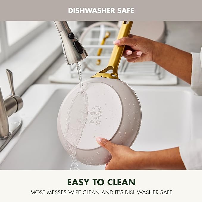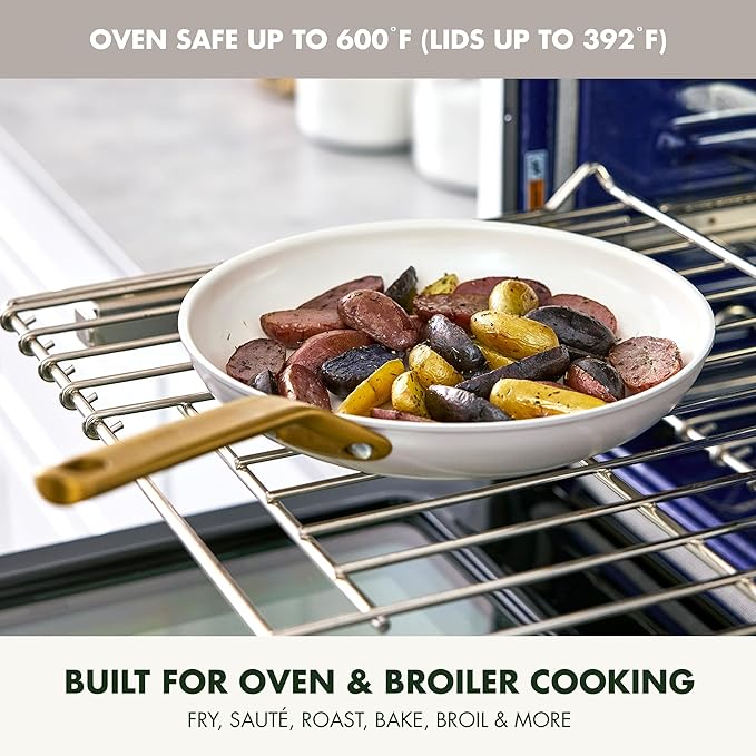 • STAINLESS STEEL GOLD-TONE HANDLES: Riveted matte-finished handles offer a safe and secure grip while adding a pop of design to any kitchen.