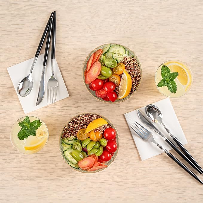 • CONVENIENT BULK PACK: This set includes 100 disposable bowls, providing ample supply for parties, weddings, or any event where you want to impress with elegant disposable plates.