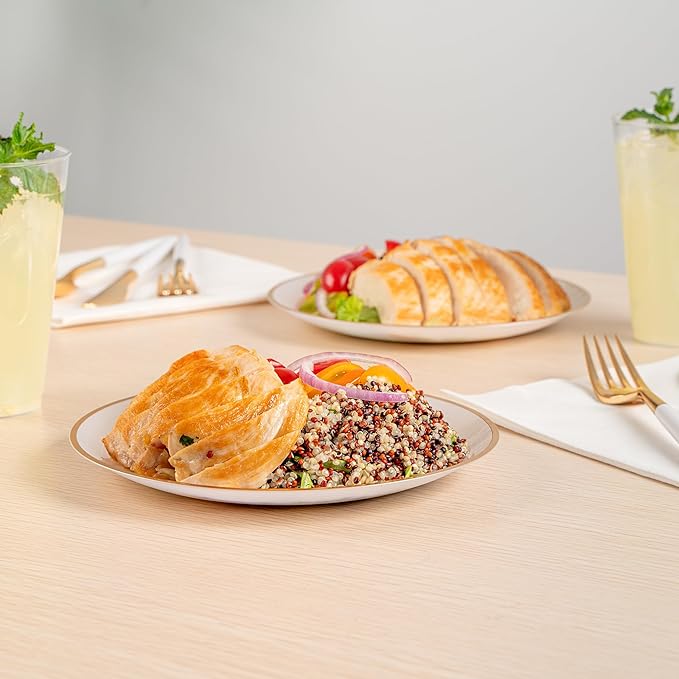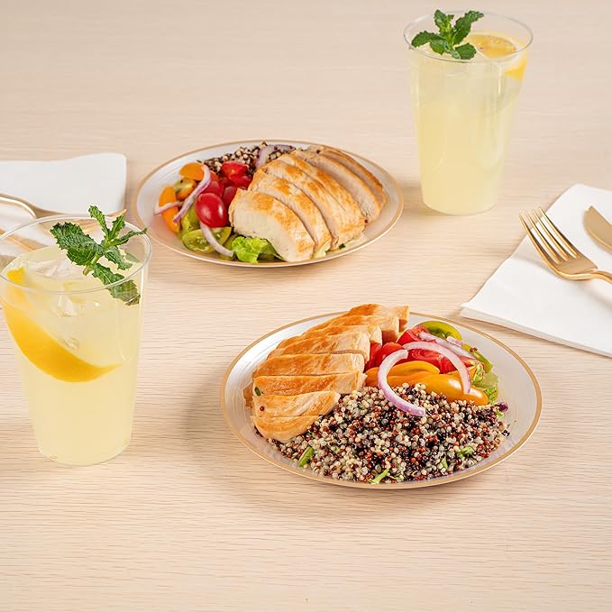 • ELEGANT PRESENTATIONS: Elevate your events with gold rimmed plates that bring sophistication to any table setting, whether it's a wedding reception, corporate event, or dinner party.