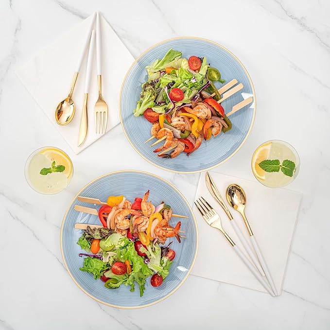 Restaurantware Plastic Plates 100 Pcs 10" Gold Rimmed Disposable Plates Heavy-Duty Blue Translucent Rippled Plastic Dinner Servers for Party, Weddings, Salads, Desserts, and Appetizers