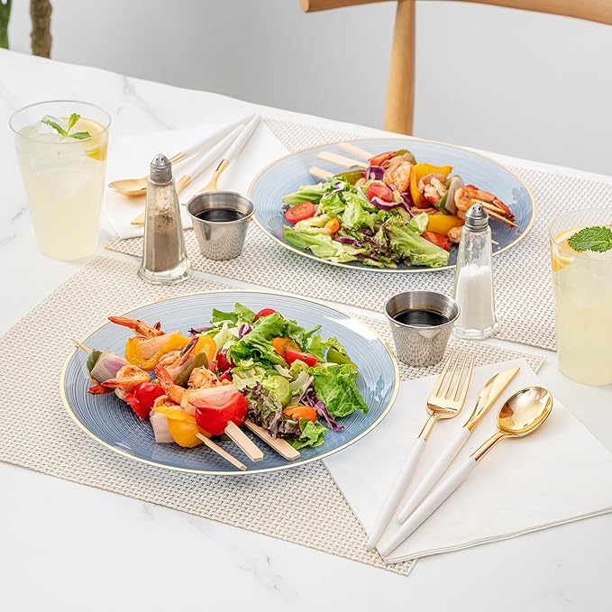 • ELEGANT PRESENTATIONS: Elevate your events with gold rimmed plates that bring sophistication to any table setting, whether it's a wedding reception, corporate event, or dinner party.
