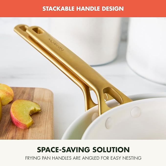 • STAINLESS STEEL GOLD-TONE HANDLES: Riveted matte-finished handles offer a safe and secure grip while adding a pop of design to any kitchen.