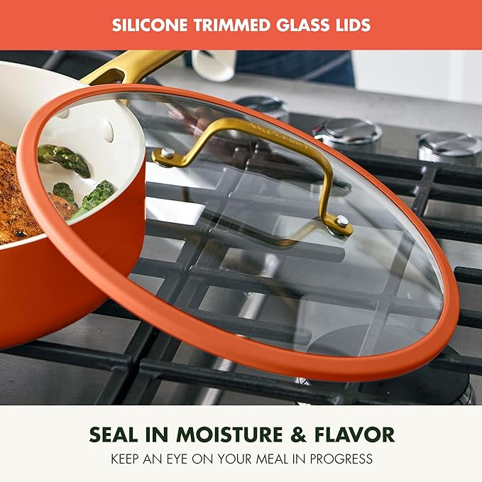 • DURABLE DOMED GLASS LIDS: The tempered glass lids feature a silicone rim to lock in heat and moisture so you can watch all the action on the outside.