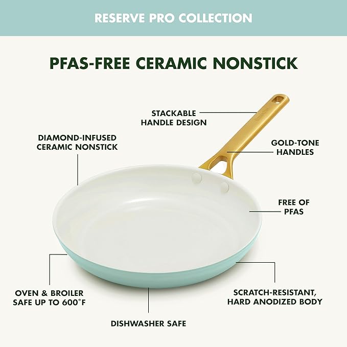 • RESERVE PRO: This collection is where high-performance cooking meets refined design. Featuring GreenPan’s most advanced ceramic nonstick, this collection delivers exceptional durability, stackable convenience, and oven-ready strength.