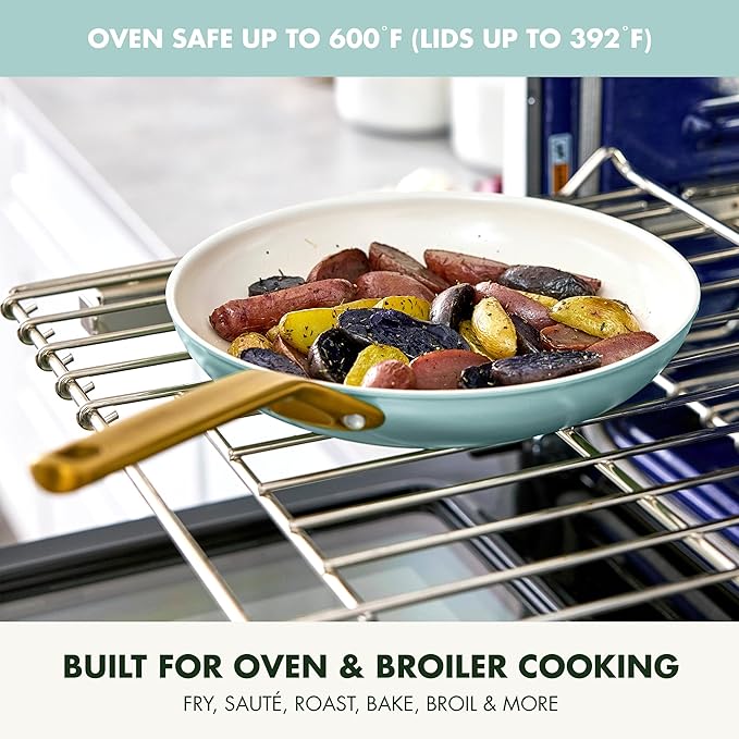• STAINLESS STEEL GOLD-TONE HANDLES: Riveted matte-finished handles offer a safe and secure grip while adding a pop of design to any kitchen.