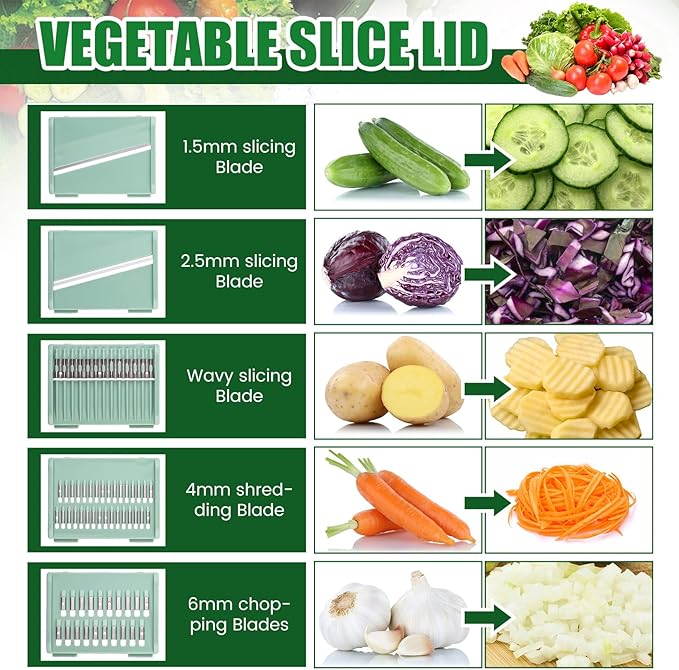 • Versatile Kitchen Essential: this 3-in-1 salad greens and vegetable cleaning spinner is a triple threat—washing, drying, and chopping all in one device; With five interchangeable blades, effortlessly slice, shred, and dice your way to a healthy meal, all while saving precious time in your busy life