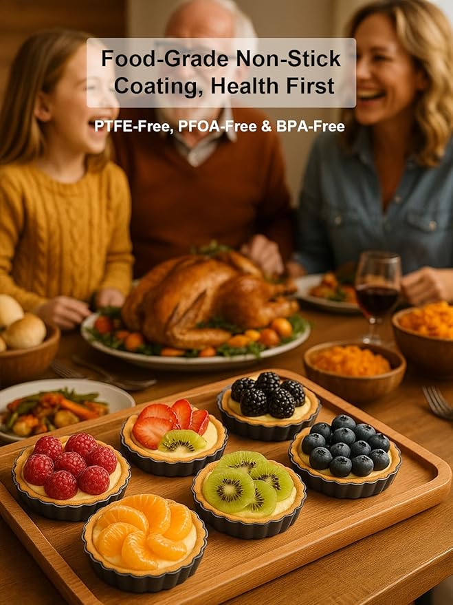 • 【Premium Non-Stick Surface--Healthy First】 Our tart pans feature a top-tier Xylan series coating by Whittford, an American coating brand, coupled with the innovative Plantinum-3X double-sided three-layer spraying process. This ensures a safe and easy-to-demould baking experience. The coating is completely free from PTFE, PFOA, and BPA, making it a healthy choice for all your baking needs.