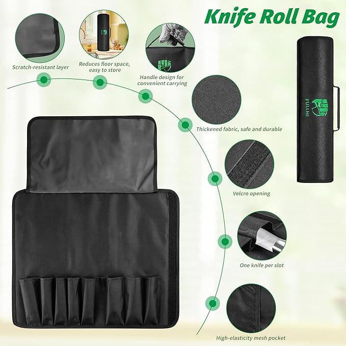 • ALL-INCLUSIVE KNIVES SET: 8" Chef Knife, 8" Slicer Knife, 8" Bread Knife, 7" Santoku Knife, 5" Santoku Knife, 7" Cleaver Knife, 5" Universal Knife, and 3.5" Paring Knife. As part of our giveaway, you'll also receive 1 Knife Roll Bag, 3 Stainless Steel Finger Guards, 1 Bottle Opener, 1 Pair of Cut Resistant Gloves, 1 Portable Knife Sharpener, and 1 Sharpening Stick. Whether you're cooking at home or outdoors, this comprehensive set is designed to meet all your needs.