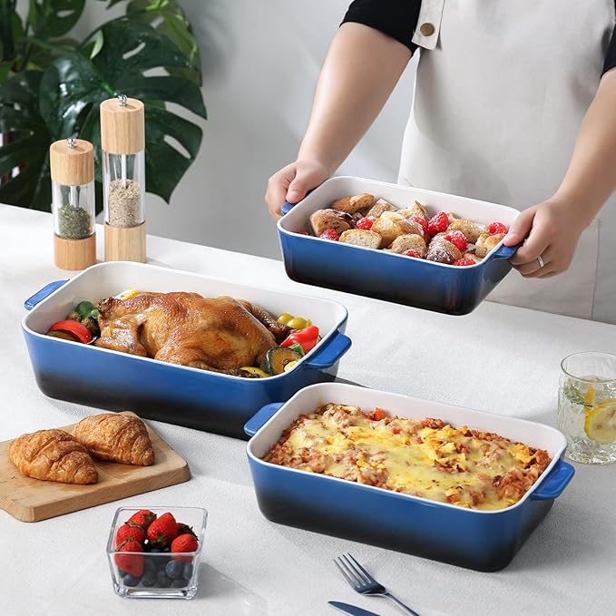 Casserole Dishes for Oven: Ceramic Rectangular Baking Dish, 14.5''/13''/10.5'' Lasagna Pans, Bakeware Sets for Cooking, Kitchen, Cake Dinner, Banquet and Daily Use, Blue