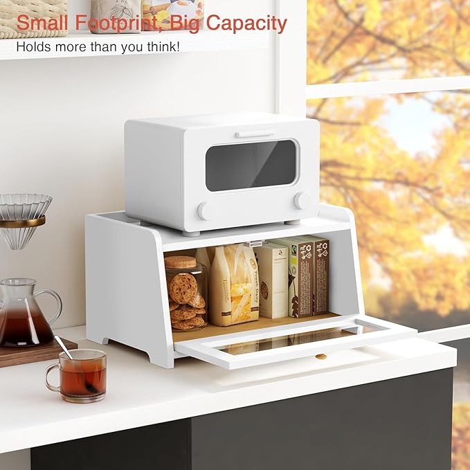 • [Good Quality and Easy Assemble] This white bread box holder is made from premium bamboo wood with exquisite workmanship. The construction of breadbox is sturdy. Every panel has been marked which make it very easy to assemble.