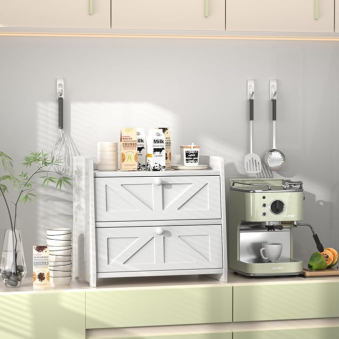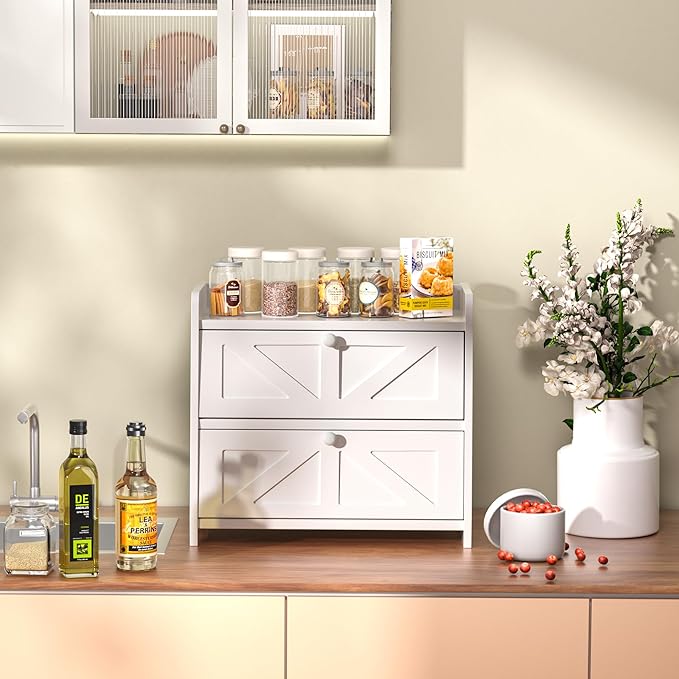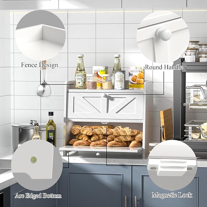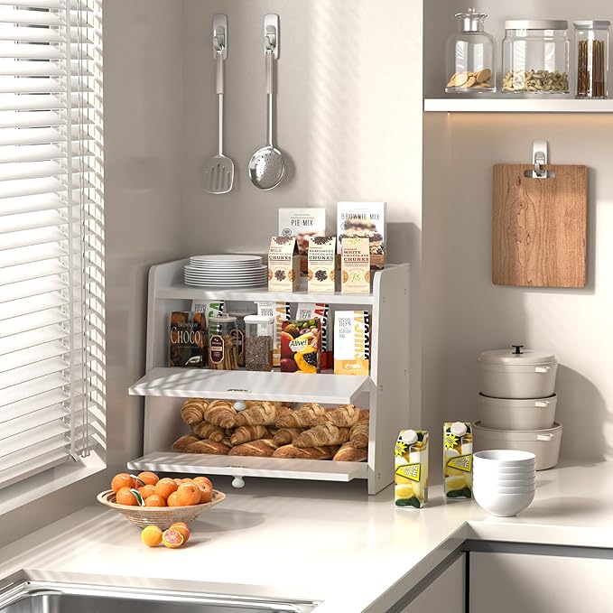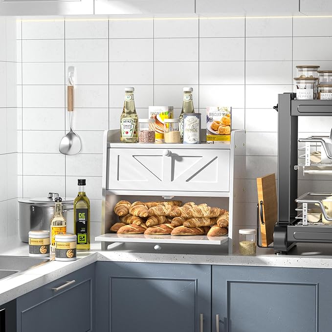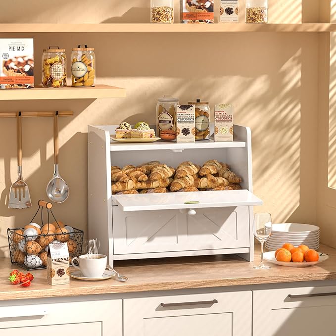 Bread Box for Kitchen Countertop, Double Layer Wooden Breadbox, Large Capacity Bread Storage Bin, Homemade Bread Storage Container, Farmhouse Breadbox Organizer, White