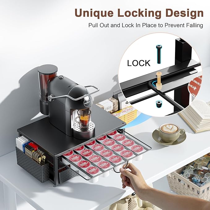 • 【 ‌Industrial-Strength Build‌】Reinforced ‌metal frame‌ ensures stability, k cup drawer organizer support most single-serve coffee machines, compatible with coffee pod holder. ‌Anti-corrosion baking paint‌ guarantees long-lasting durability. Sleek design blends into kitchens or offices, keep coffee station tidy and maximizing counter space‌