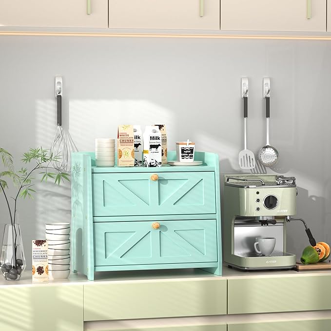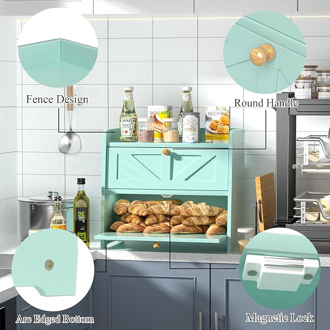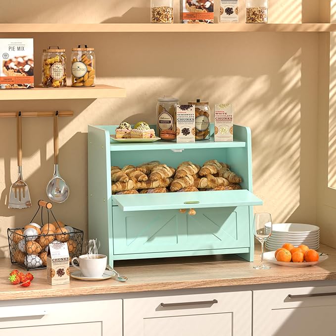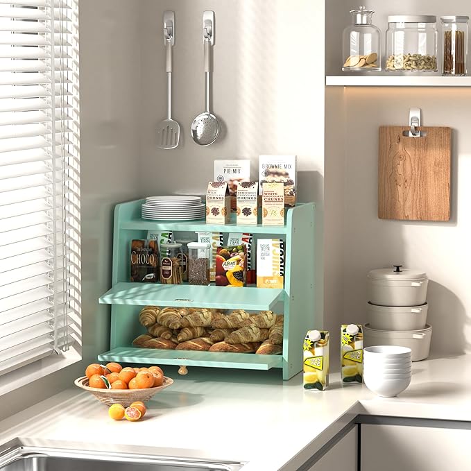 Bread Box for Kitchen Countertop, Double Layer Wooden Breadbox, Large Capacity Bread Storage Bin, Homemade Bread Storage Container, Farmhouse Breadbox Organizer, Green