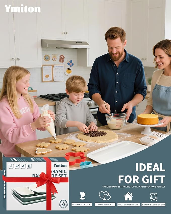 • 33 PCS COMPLETE CERAMIC BAKEWARE SETS: Includes essential bakeware for all baking needs: cookie sheets, round cake pans, loaf pan, muffin pans (12 & 6 cup), and roasting pan- perfect for cakes, cookies, muffins, roasting, and sheet pan dinners, 24 cupcake liners for baking, ideal for multi-tasking in the kitchen