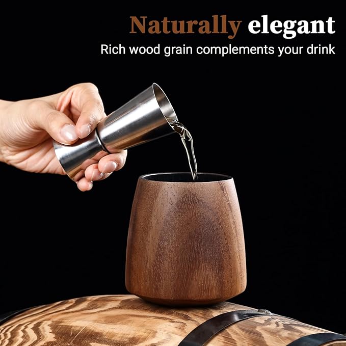 • 【Premium Handcrafted Acacia Wood Whiskey Glass】Hand-carved from premium Acacia wood, this whiskey glass is hard, durable. Its smooth, warm surface feels comfortable in hand, resistant to water and warping, ensuring long-lasting use for bourbon, whiskey, or old fashioned cocktails.