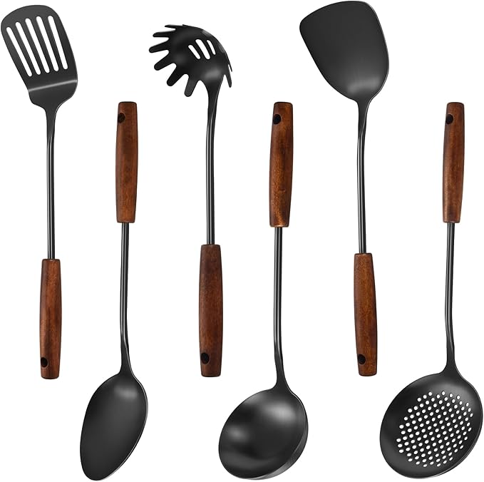 304 Stainless Steel Kitchen Utensils Set, 6 Pcs Long Cooking Utensils Set with Wooden Handle, Large Heat Resistant Kitchen Tools(Black, Dishwasher Safe)