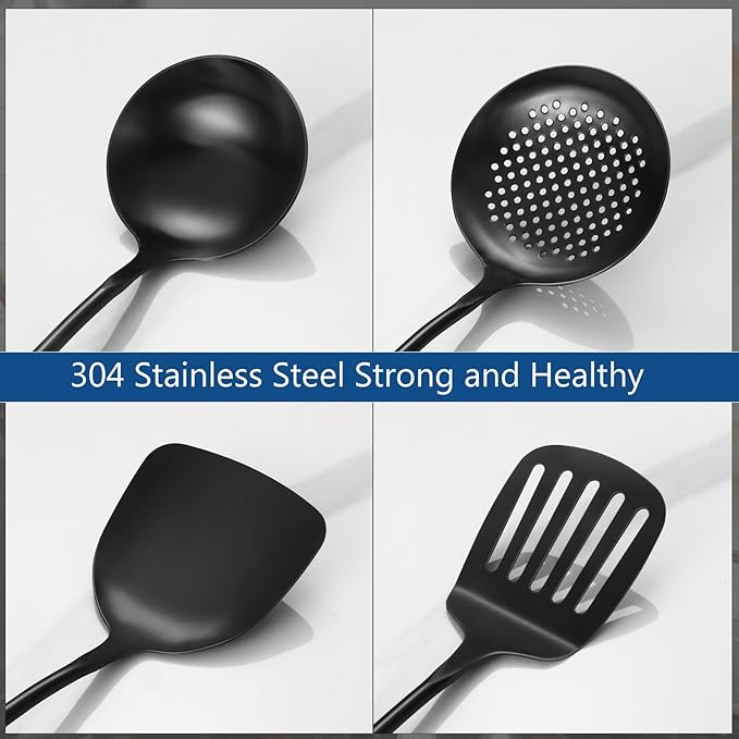 • Environmentally friendly large cooking utensil set: This stainless steel cooking utensil set comes with a comfortable, non slip grip on each piece, and these metal kitchen utensil sets can be safely used to cook any type of food. Compared to silicone materials, stainless steel cookware is more environmentally friendly and harmless to the body