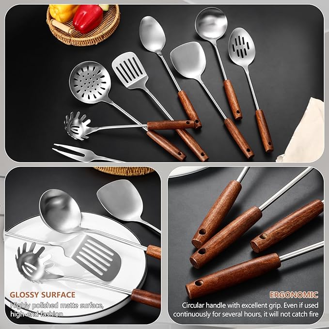• High quality kitchen utensil set: This stainless steel cookware is made of heavy-duty 304 stainless steel of restaurant quality, with a wooden handle designed ergonomically to provide a comfortable grip and ensure long-term use and easy cleaning