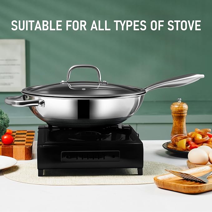 Hybrid 12-Inch Wok with Lid,Nonstick Stainless Steel Woks & Stir-fry pans,Stay-Cool Handle,PFOA Free Cookware,Dishwasher and Oven Safe,Compatible with All Cooktops