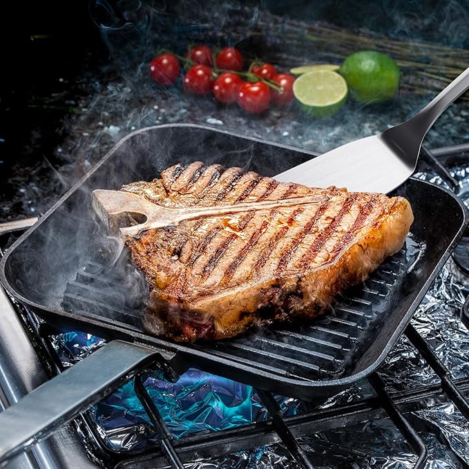 • Premium Materials: This metal spatula is made of 18/0 stainless steel. It is not only sturdy and reliable but also resistant to high-temperature cooking.