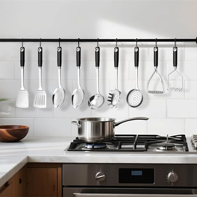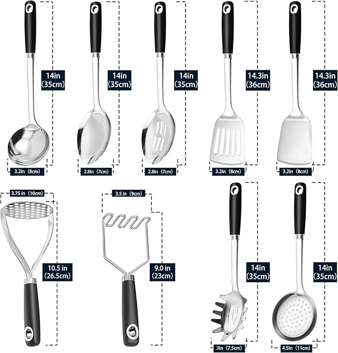 • 9-in-1 SET: Two spatulas, two cooking spoons, two potato mashers, a ladle, a skimmer & a pasta spoon.