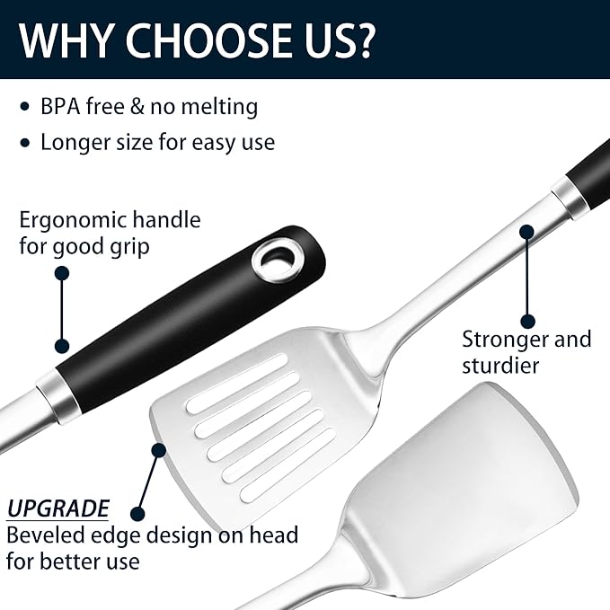 • HEAVY DUTY: Unlike most cheap utensils set, this set is made of 2.6mm thick food grade stainless steel. They're durable and sturdy enough for most kitchen jobs for many years