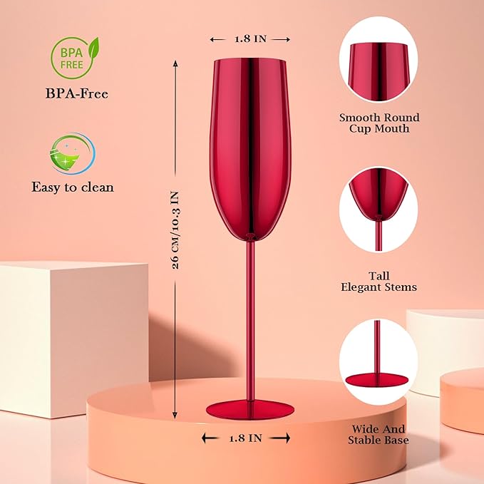 • Durable and sturdy: Our champagne flutes are made of food grade stainless steel material, the electroplated surface resists corrosion, ensuring they remain sturdy and unbreakable. Perfect for repeated use, these metal wine glass are ideal for any occasion